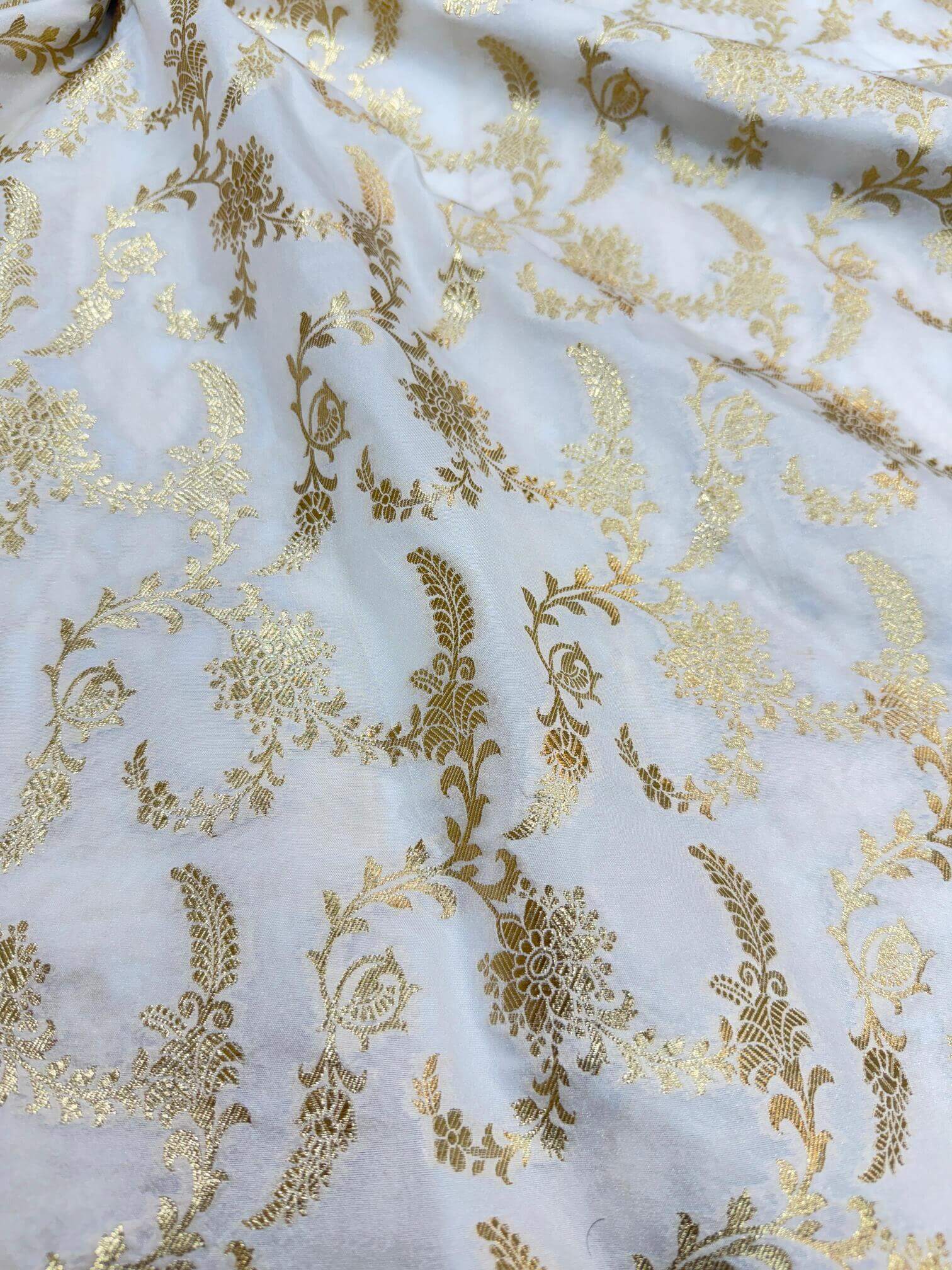 A stunning canvas for your creativity, this Design 6 Banarasi lehenga set is made from poly semi katan silk with intricate golden zari weaving. Completely unstitched and dyeable, it’s perfect for custom couture, festive wear, or bridal ensembles.