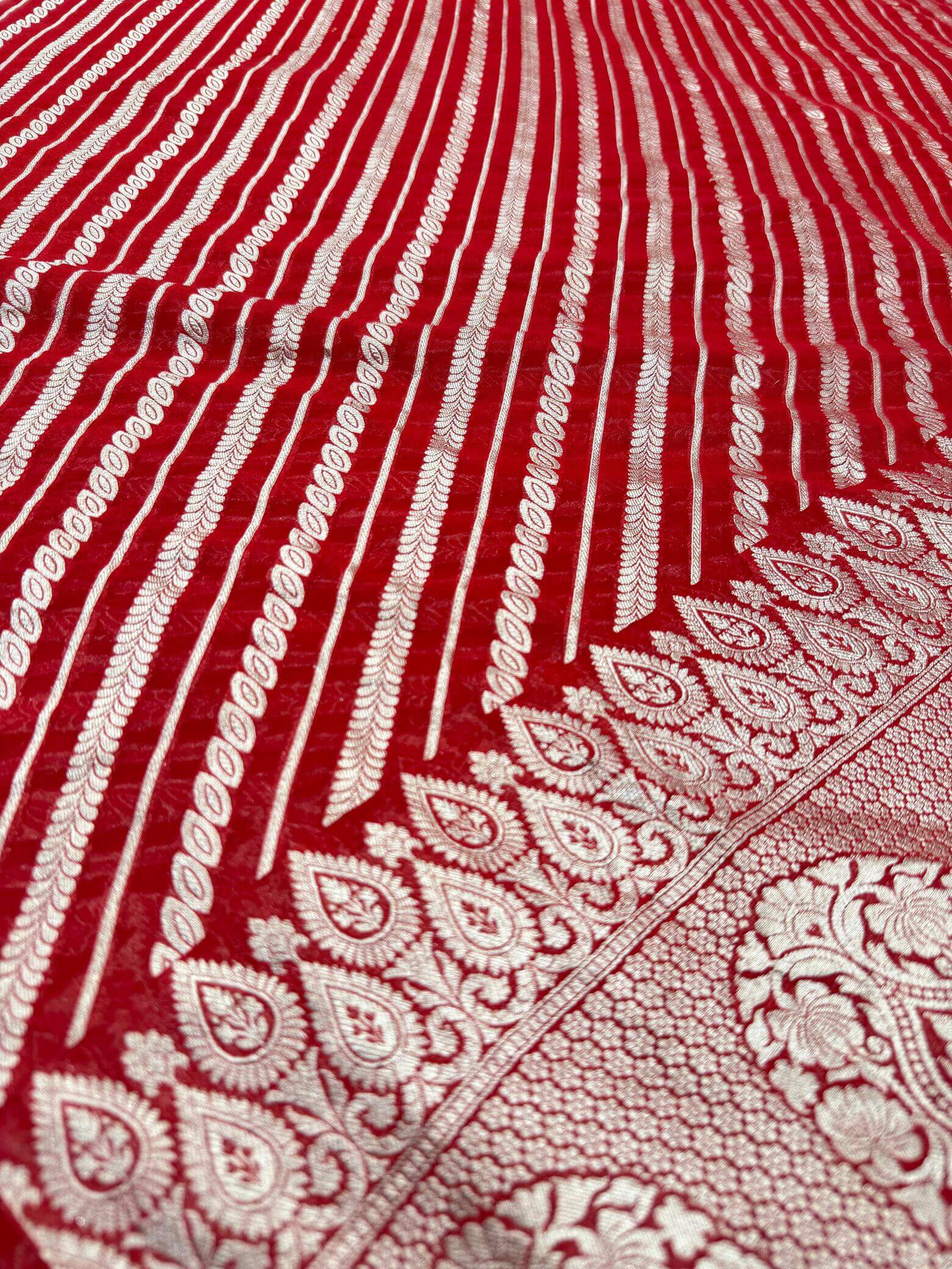 Classic and timeless, this khaddi georgette dupatta in a bold red hue features intricate Aada design motifs woven with soft water zari. Its airy texture and luxurious finish make it the perfect companion for ethnic suits, sarees, or lehengas.