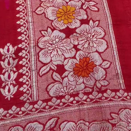 Crafted from luxurious Tussar Georgette, this pure khaddi saree in classic Red showcases intricate Boota & Jaal patterns woven in Kadhva Real Zari. The rich texture and fluid drape make it a regal pick for weddings, festivals, and heirloom occasions.