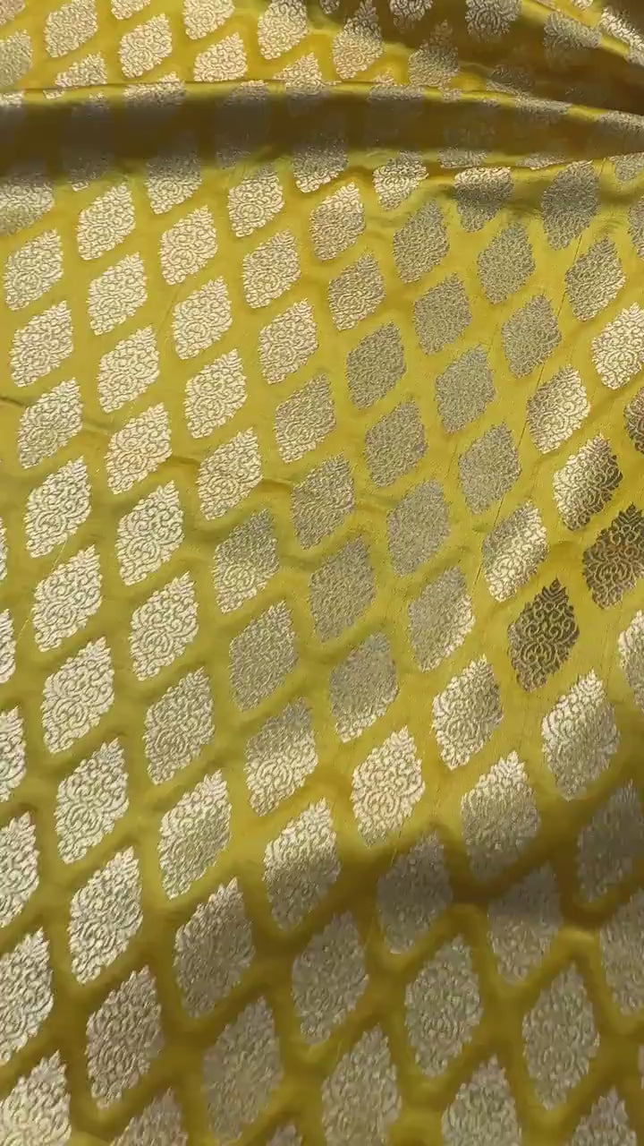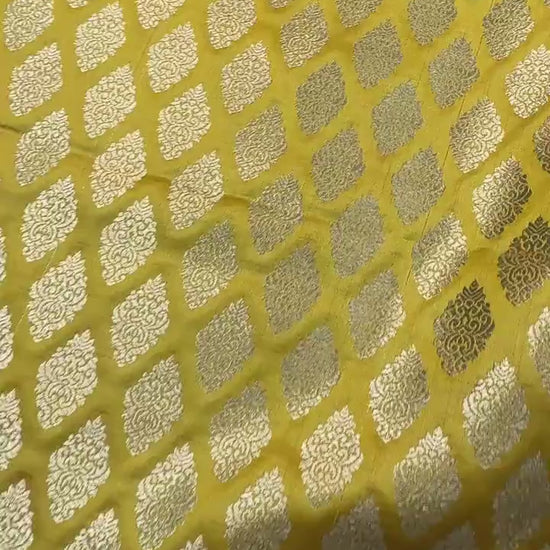 Bright, festive, and full of tradition — this Satin Brocade Fabric in Yellow Gold Haldi features classic Boota motifs woven in premium Zari Silk. A perfect pick for blouses, lehengas, kurtas, and statement occasion wear.